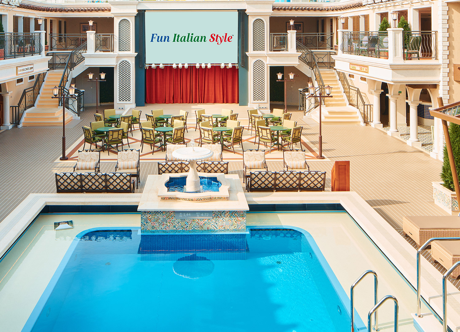 Carnival Seaside Theater / Dive-In Movies has a 12' x 22' LED screen with dive-in movies during evening hours. Ship guests can enjoy movies, sporting events, concerts, the 'Morning Show' hosted by the Cruise Director, and beverage services with popcorn and drink specials.