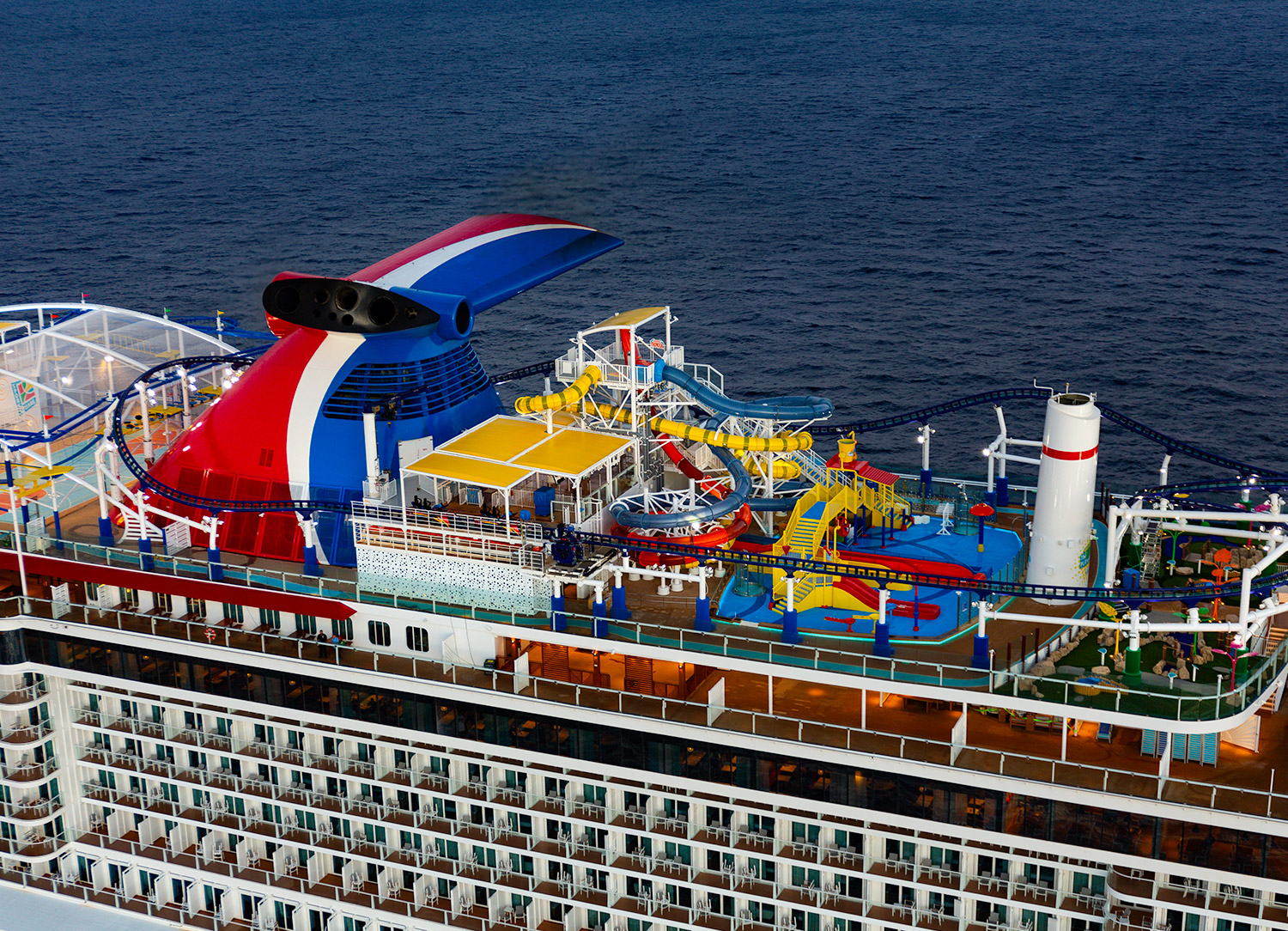 One of Carnival's signature entertainment spaces, Carnival Jubilee boasts one of the largest of the fleet's onboard water parks to date. With multiple twisting waterslides, stationary water toys, and more, it's a fun-filled time for guests of all ages.