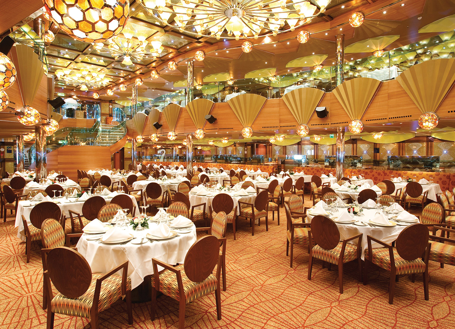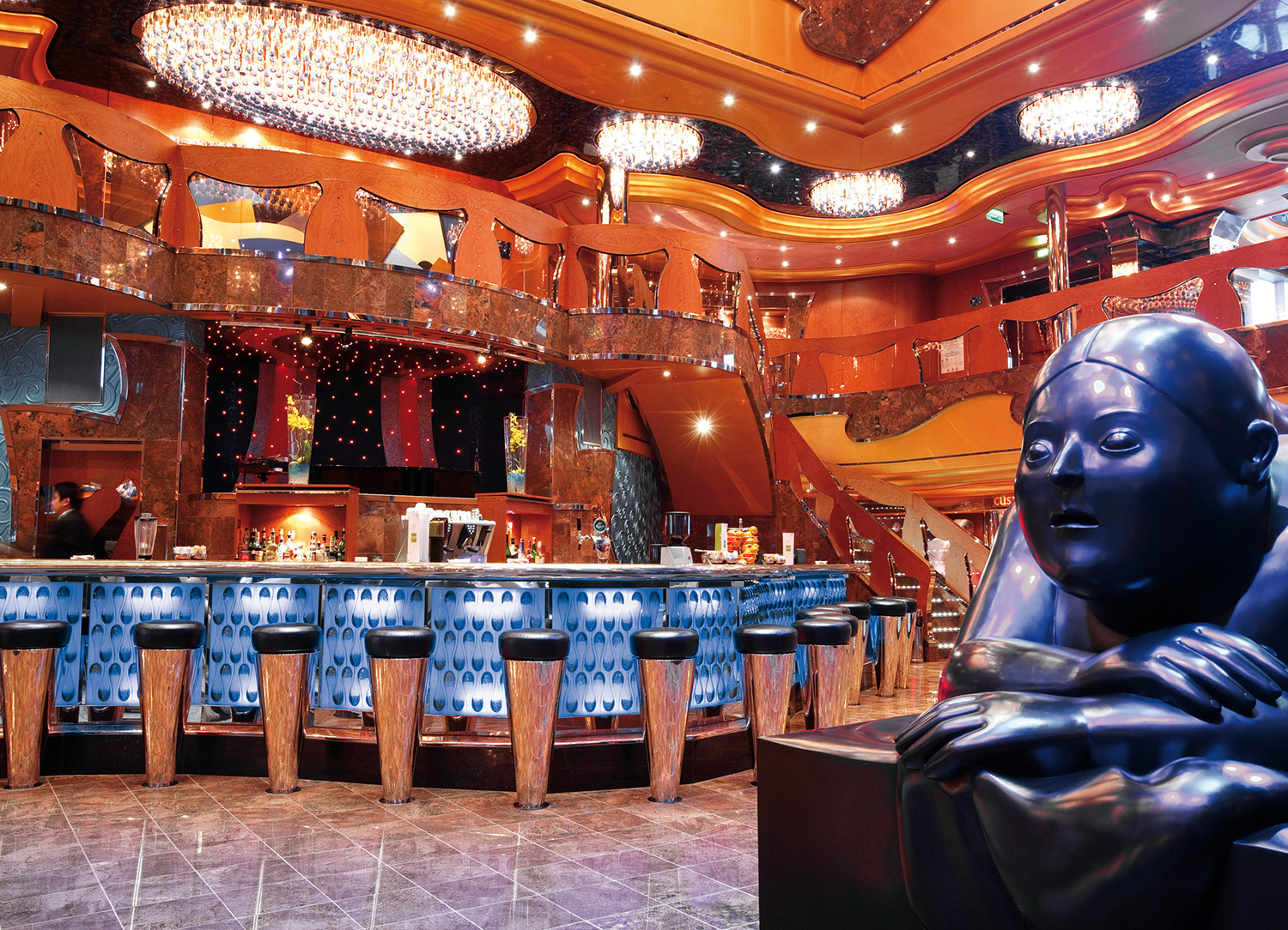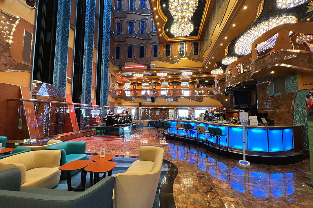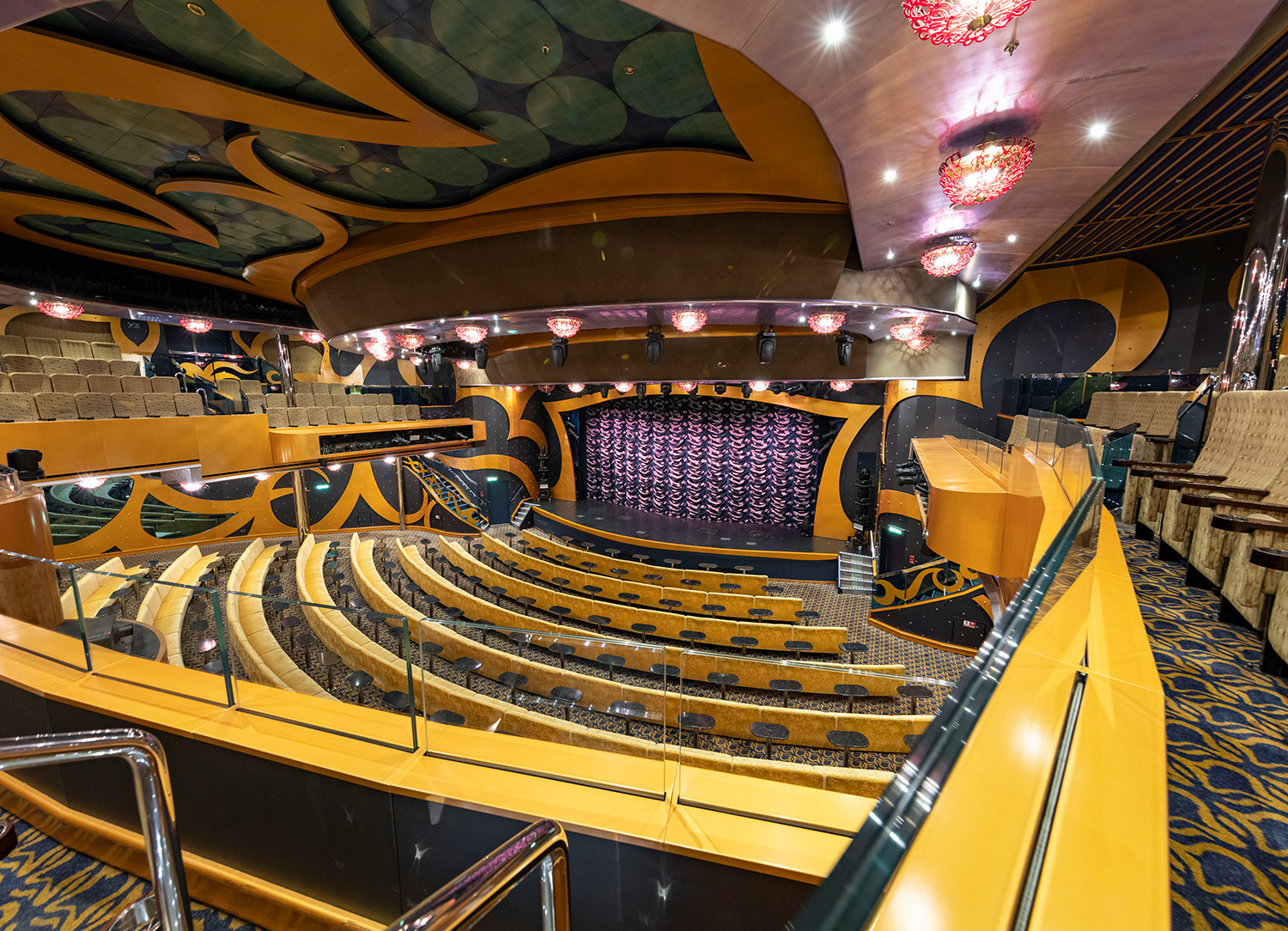 The three-level Luminosa Theater is the main show lounge on board Carnival Luminosa ship. It hosts playlist productions, seminars and talks, audience participation games like Bingo, dance classes, and more. Guests can view the scheduled activities in the HUB application.