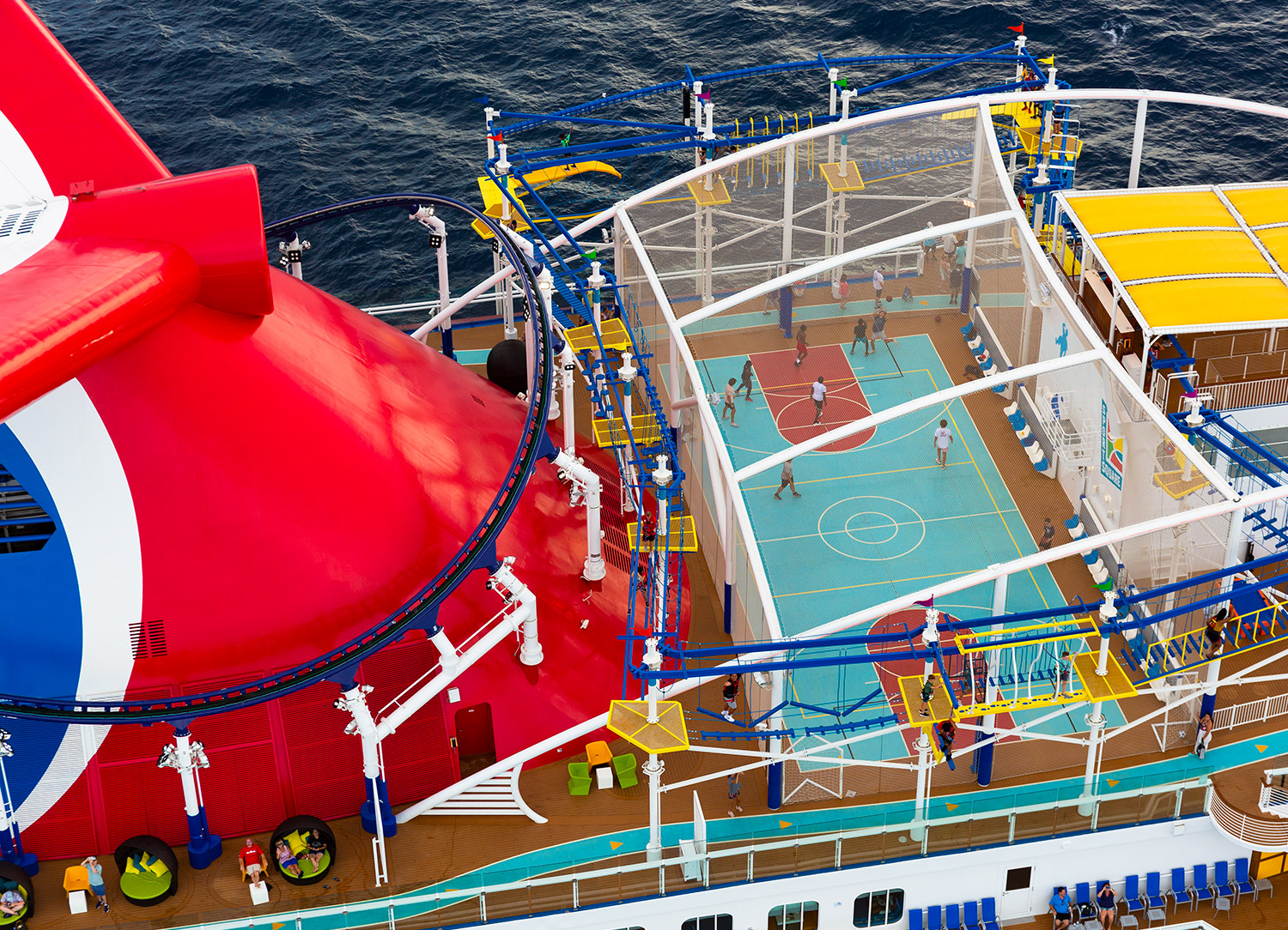 Another signature space on board many Carnival cruise ships is the SportsSquare, featuring a basketball court, a 600’-long rope course, a nine-hole mini-golf course, a padded jogging track, and more.