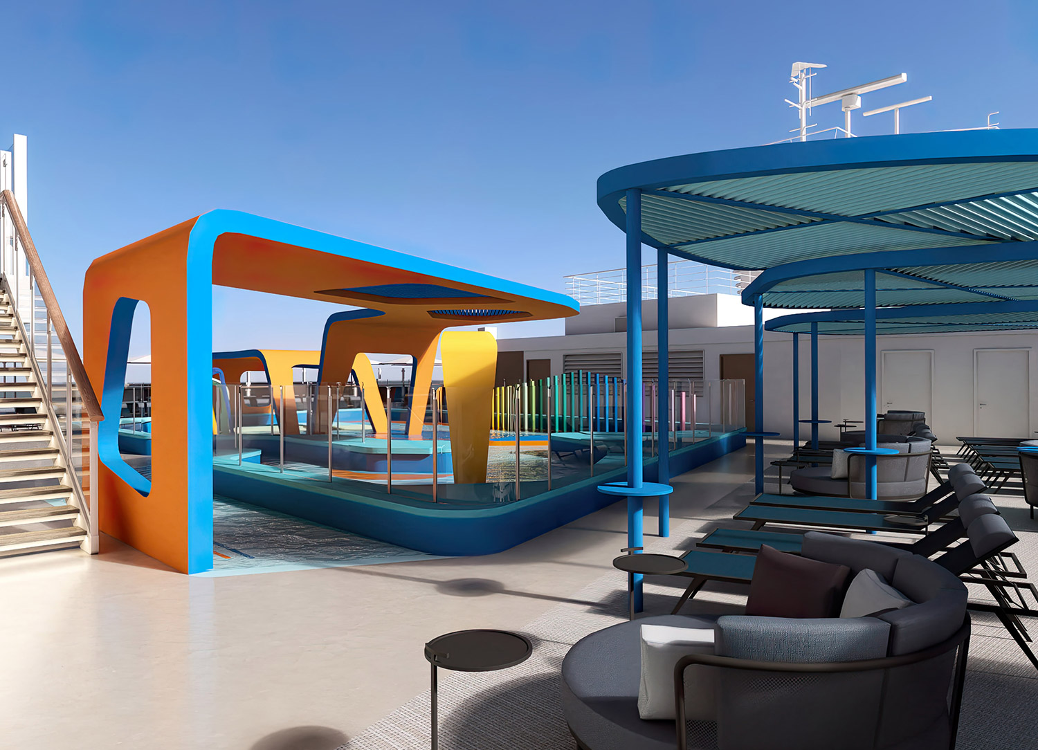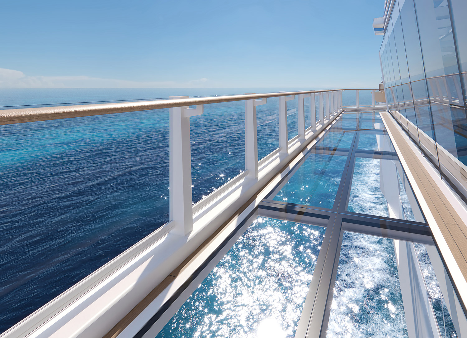 A wonderful area aboard Norwegian Aqua ship that's filled with fantastic experiences, including beautiful 360° views of the vessel's surroundings, a glass bridge ("Oceanwalk"), fire pit, restaurants, Infinity Beach (home to stunning infinity pools that were designed to blend into the ocean visibly), and much more.
