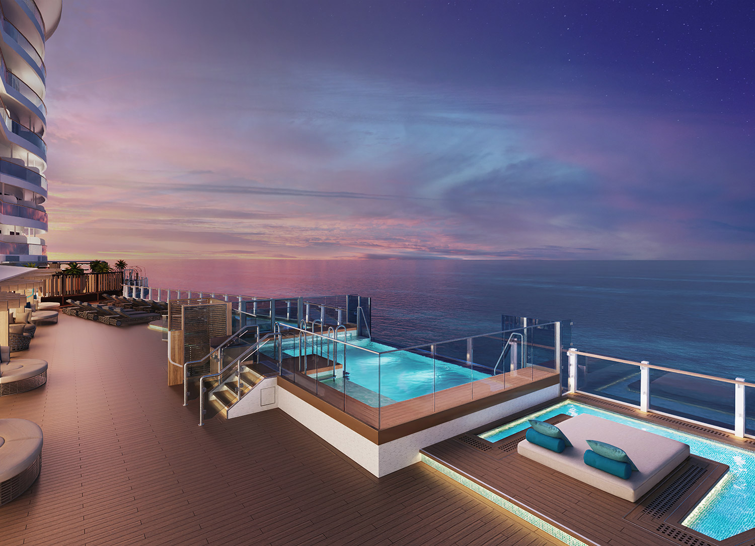 A wonderful area aboard Norwegian Viva ship that's filled with fantastic experiences, including beautiful 360° views of the vessel's surroundings, a glass bridge ("Oceanwalk"), fire pit, restaurants (including Onda By Scarpetta, The Local Bar & Grill, and Los Lobos), Infinity Beach (home to stunning infinity pools that were designed to blend into the ocean visibly), Indulge Food Hall (where guests can grab a seat, hammock, daybed or private cabana and enjoy their fill of customizable small plates from a diverse range of mouthwatering cuisines, or sit back and sip tasty cocktails at the outdoor bar), and much more.