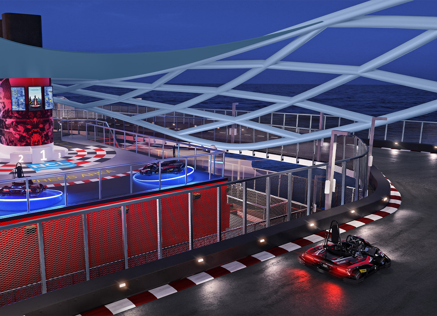 The Viva Speedway is longer, larger, and zoomier than ever! Guests aboard Norwegian Viva can speed across the horizon on the three-level race track at sea.