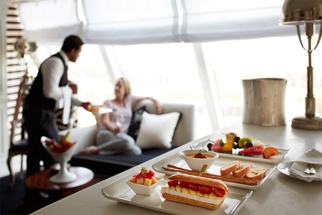 If you simply want to relax, you may dine in the privacy of your suite or stateroom. An extensive room service menu is available around the clock