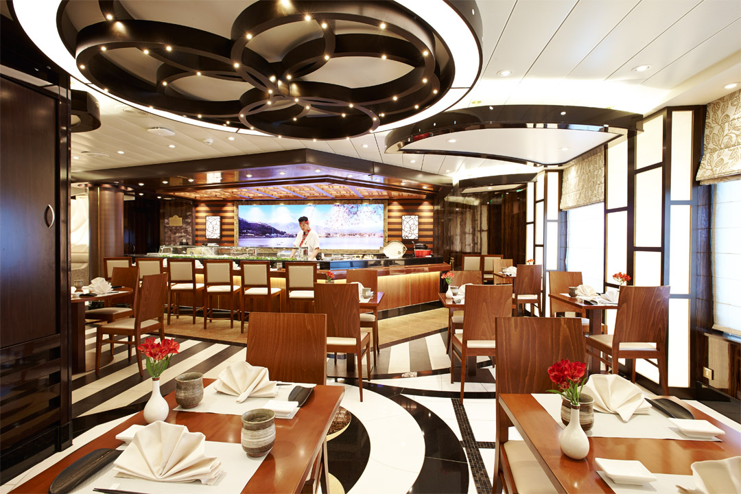 Diamond Princess is unique in that it has five main dining rooms instead of two or three. Each main dining room shares the same menu and rotates in what type of dining it hosts each night.