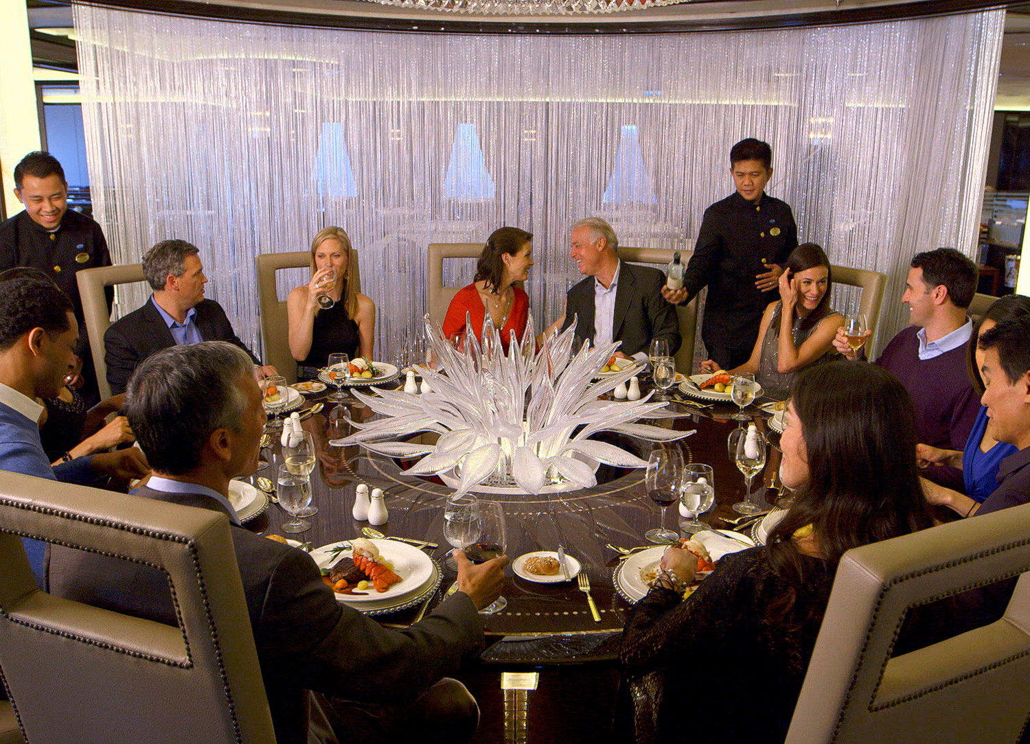 This truly special Princess Cruises signature experience is taken up a notch onboard Royal Princess. Chef’s Table Lumiere is a unique dinner where an executive chef cooks the meal and explains their techniques following an exclusive tour of the galley, complete with champagne and hors d’oeuvres. A softly-lit curtain of light surrounds the diners, creating a private space within the Concerto dining room. Dinner is served on a custom-made glass table. A $95 per person free applies for those that opt to dine at Chef’s Table Lumiere (subject to change).